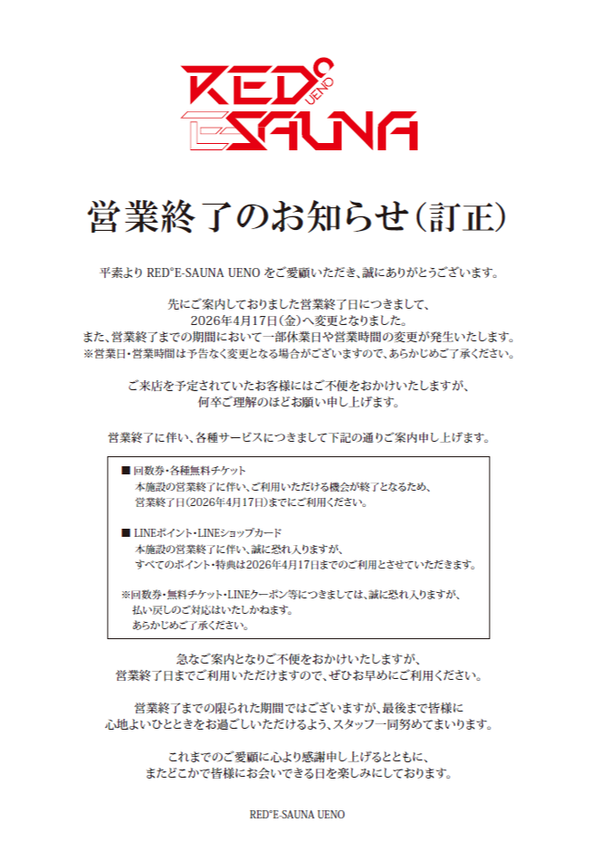 平素より RED°E-SAUNA UENO をご愛顧いただき、誠にありがとうございます。